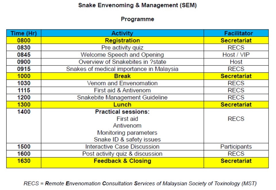 SEM was first introduced in 2010 as a pre-conference workshop during the Biennial Scientific Meeting of the Postgraduate Medical Education Society (PGMES) at Hospital Sultanah Bahiyah, Alor Setar, Kedah. Since its inception, SEM has served as a dynamic platform for healthcare providers to share knowledge, experiences, and best practices. With its interactive, open, and guided approach, SEM fosters adult learning in a supportive environment, empowering participants with confidence and competence in treating snakebite envenoming cases.